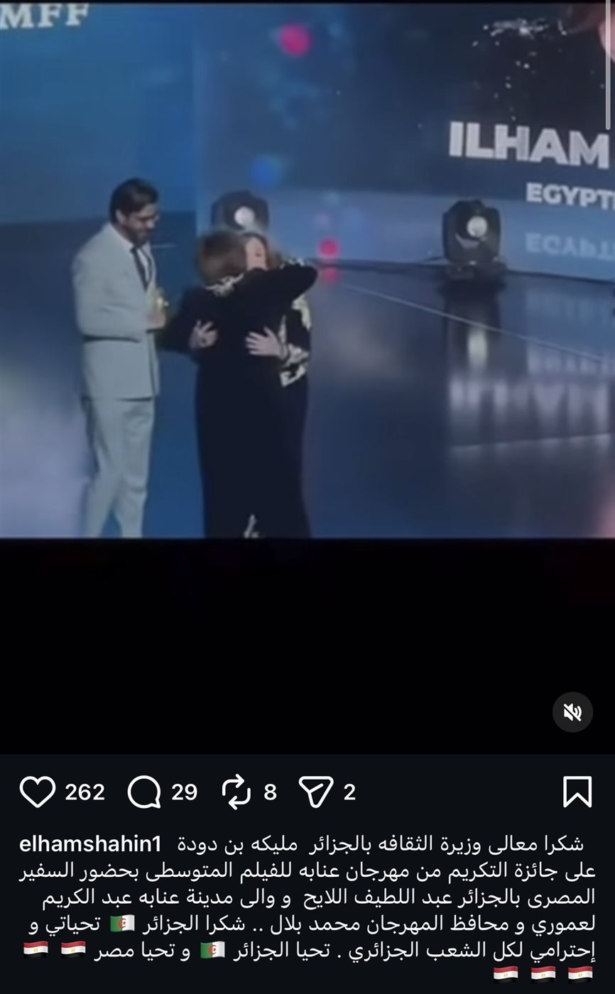 ونشرت إلهام شاهين عبر حسابها الرسمي على “إنستجرام” مقطع فيديو يوثق لحظة التكريم وعلقت عليه برسالة عبرت فيها عن امتنانها قائلة: “شكرا معالي وزيرة الثقافة بالجزائر مليكة بن دودة على جائزة التكريم من مهرجان عنابة للفيلم المتوسطي” كما وجهت التحية للشعب الجزائري مؤكدة اعتزازها بهذا التكريم الذي يعكس عمق العلاقات الثقافية بين مصر والجزائر.