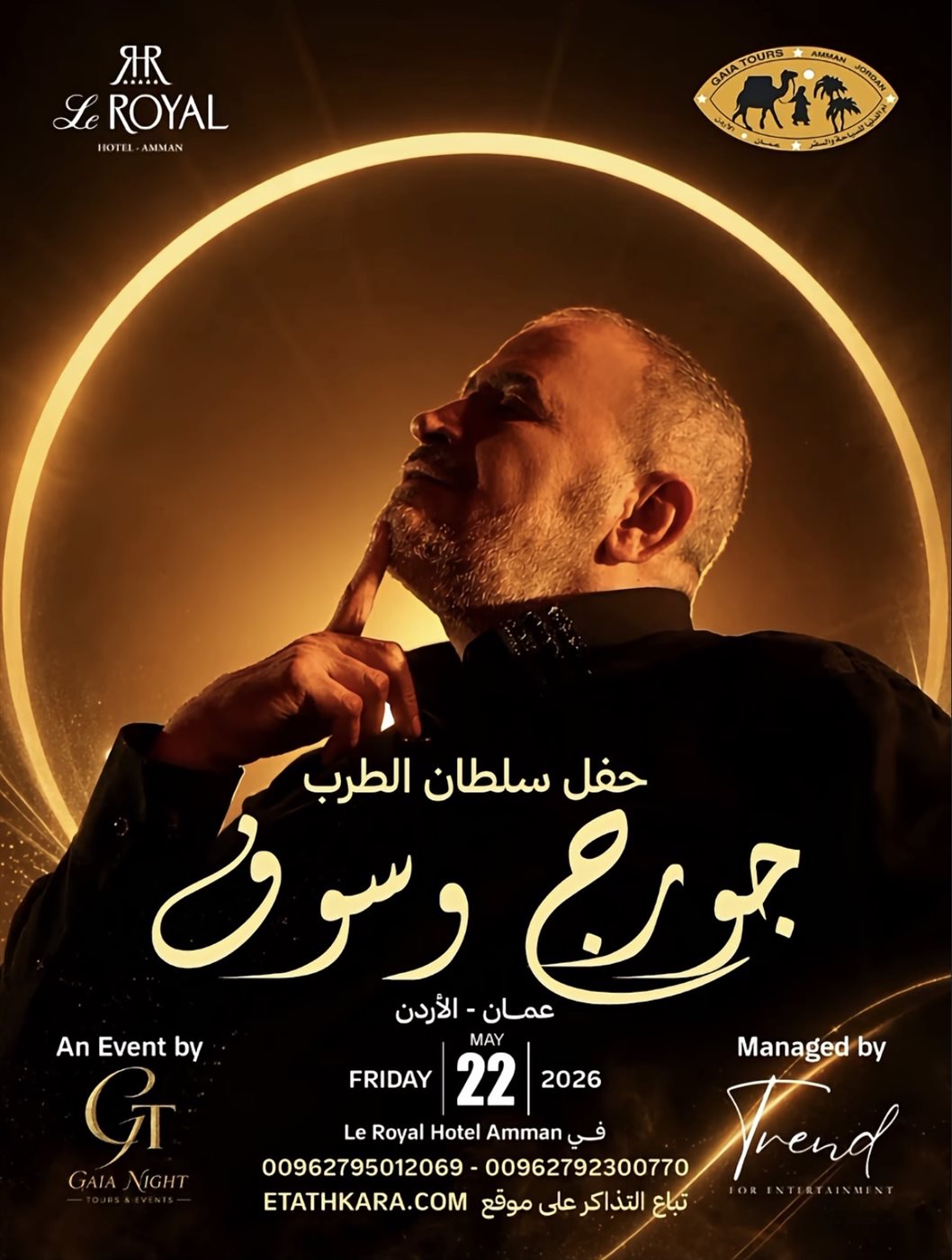 تتجه أنظار عشاق الطرب الأصيل في الأردن والعالم العربي نحو العاصمة عمّان حيث يستعد سلطان الطرب جورج وسوف لإحياء حفل غنائي ضخم يوم 22 مايو 2026 داخل Le Royal Hotel في واحدة من أبرز السهرات الفنية المنتظرة خلال الموسم الحالي والتي تشهد إقبالا جماهيريا واسعا قبل موعدها بأسابيع.