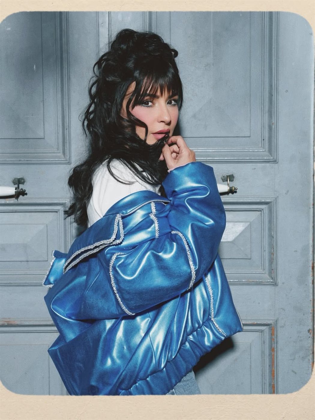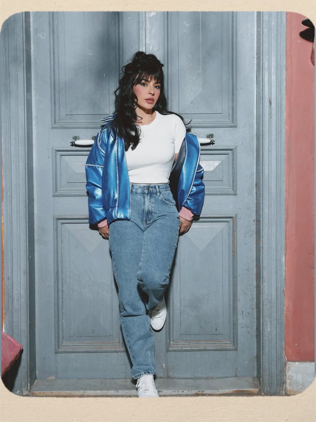 وظهرت ماغي في الإطلالة بستايل كاجوال مستوحى من صيحات تلك الحقبة، حيث اختارت بنطلون Mom Jeans بخصر عالٍ، وهو من القطع التي عادت بقوة إلى عالم الموضة مؤخرًا، لما توفره من راحة وأناقة يومية. ونسّقت معه توب بيضاء بسيطة منحت الإطلالة طابعًا هادئًا، قبل أن تضيف عنصر الجرأة عبر جاكيت جلد Oversized باللون الأزرق اللامع، جاء مزينًا بخطوط فضية عكست روح التسعينيات الصاخبة.