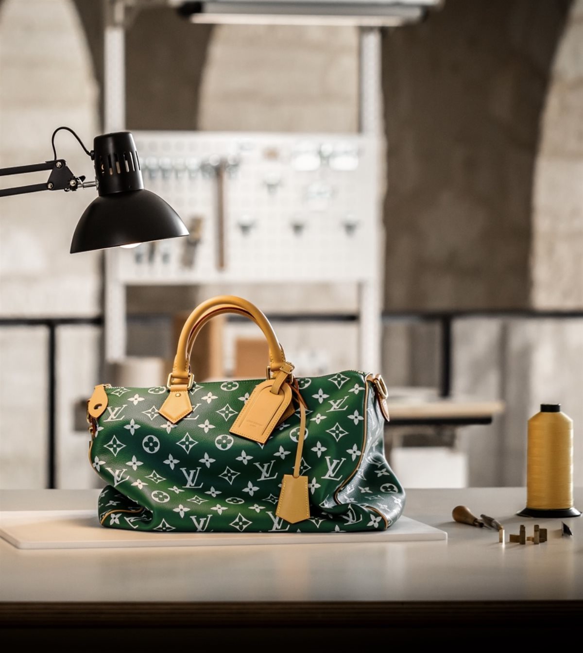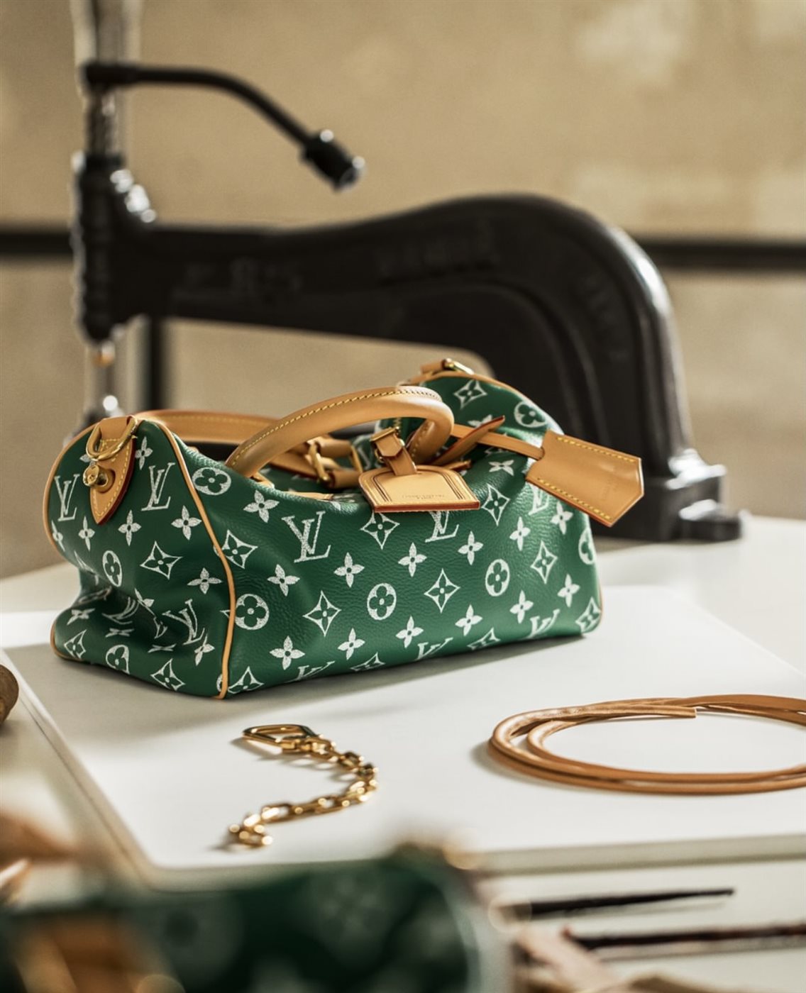ومن الناحية التصميمية، تأتي حقيبة Speedy بإصدار لافت باللون الأخضر مع نقشة المونوغرام البيضاء الشهيرة، ما يمنحها طابعًا عصريًا جريئًا دون أن تفقد هويتها الكلاسيكية. كما تظهر التفاصيل الجلدية باللون البني الفاتح، لتضيف تباينًا بصريًا يعزز من فخامة القطعة ويبرز جمال خطوطها. هذا التوازن بين الجرأة والتقاليد يعكس توجهًا واضحًا لدى الدار نحو تقديم تصاميم تناسب الأذواق الحديثة مع الحفاظ على الإرث العريق.