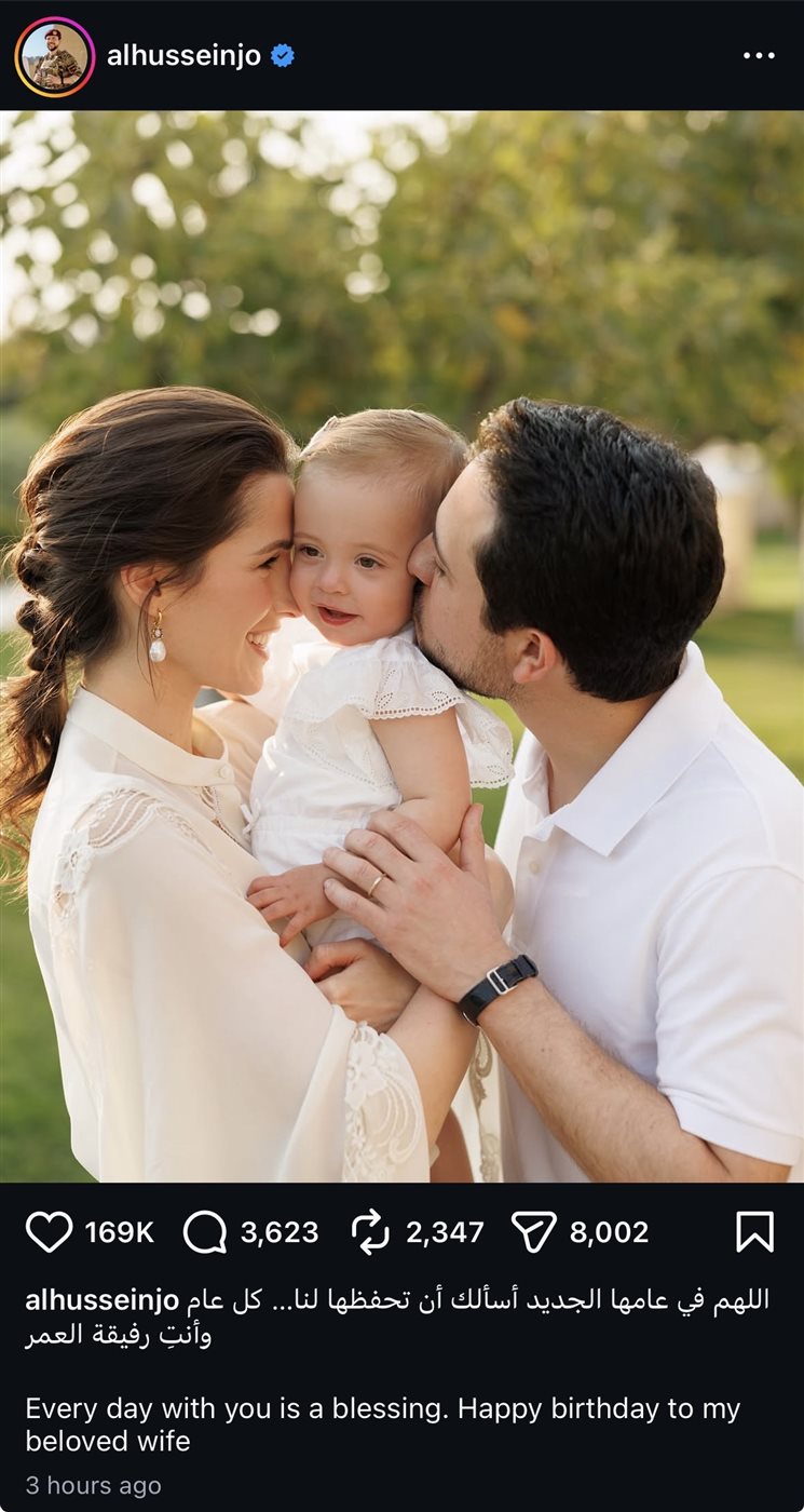 من جانبه وجه الأمير الحسين بن عبدالله الثاني رسالة رومانسية مؤثرة لزوجته حيث نشر صورة عائلية جمعتهما برفقة ابنتهما الأميرة إيمان بنت الحسين وكتب:"اللهم في عامها الجديد أسألك أن تحفظها لنا كل عام وأنتِ رفيقة العمر".