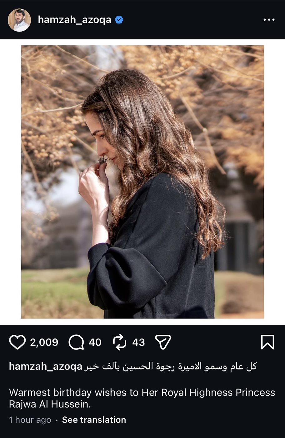 كما شارك المصور الخاص لولي العهد حمزة أزوقه صورة جديدة للأميرة رجوة احتفالا بهذه المناسبة ما زاد من حالة التفاعل عبر المنصات الرقمية.