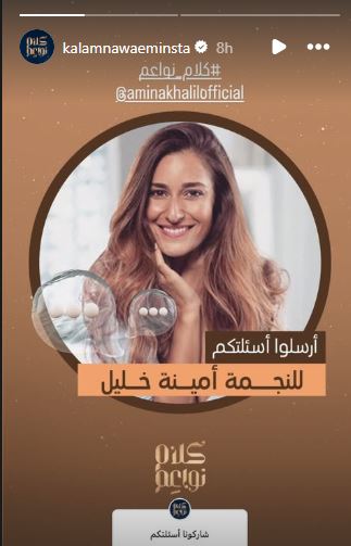 وشاركت الصفحة الرسمية لبرنامج “كلام نواعم” عبر “ستوري” الحساب الرسمي على موقع الصور والفيديوهات الشهير “إنستجرام”، صورة كشفت خلالها عن استضافة أمينة خليل قريبًا، وأن الصفحة ستتلقى الأسئلة التي يرسلها الجمهور لهم من أجل سؤالها خلال الحلقة والتي سيتم تصويرها قريبًا.