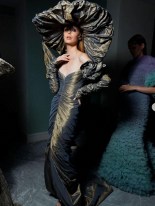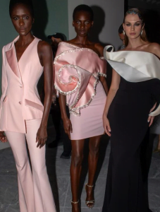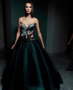 احتوت المجموعة أيضًا على فساتين مناسبة للسهرات وفساتين مزودة بتصميم الكورسيه مع التنورات المنسدلة.