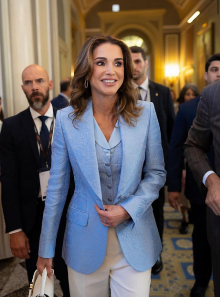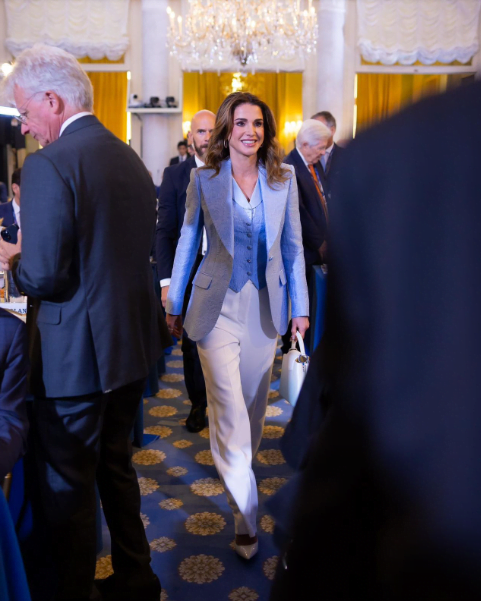 تألقت الملكة رانيا وظهرت بإطلالة كلاسيكية مثالية، عبارة عن بليزر وفيست متتطابقين باللون اللبني، من دار الأزياء العالمية دولتشي آند جابانا، مع بنطلون أبيض كلاسيكي، واختارت حقيبة يد باللونين الأبيض والأزرق من دار أزياء لويس فيتون، وانتعلت حذاءً أنيقًا ذا كعب عالٍ باللون الأبيض، ولم تبالغ في الإكسسوارات والمجوهرات.